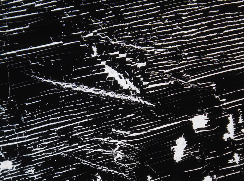 Overwriting and encrustations for a collection of assemblages where technical discontinuities, like those between film and video or analogue and digital image processing, combine and clash in the form of material traces that chisel and wrinkle the surface of the image. Old trailers, phantom broadcasts, hard drive scraps: memories resurfacing to create layered tracks where different media temporalities haunt each other. (T.I.)